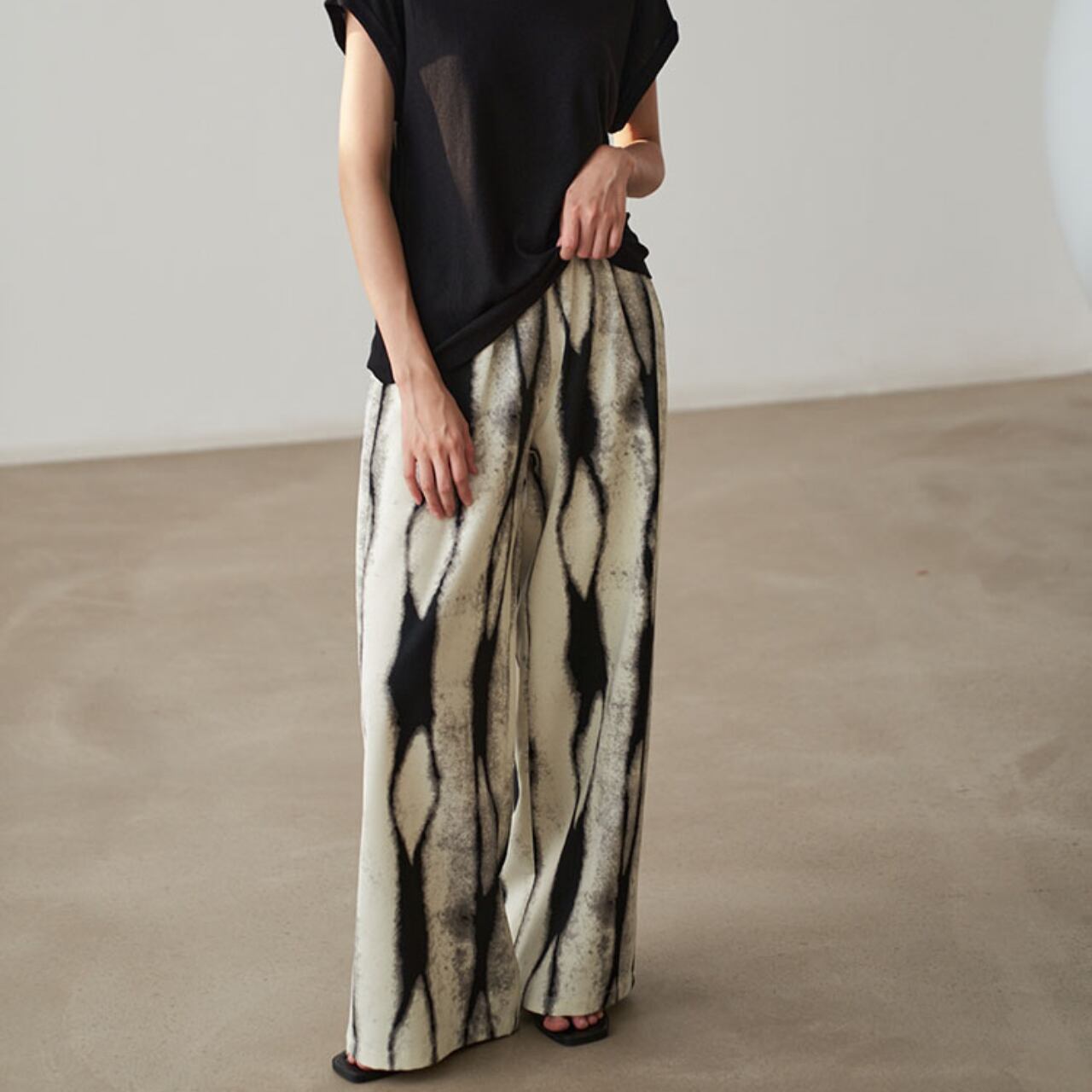 今季トレンドのワイドレッグシルエットと、目を惹く抽象柄が魅力のパンツ。お尻周りをさりげなくカバーしてくれる丈感も嬉しいポイントです。シンプルなトップスと合わせるだけで、洗練されたスタイリングが完成します。