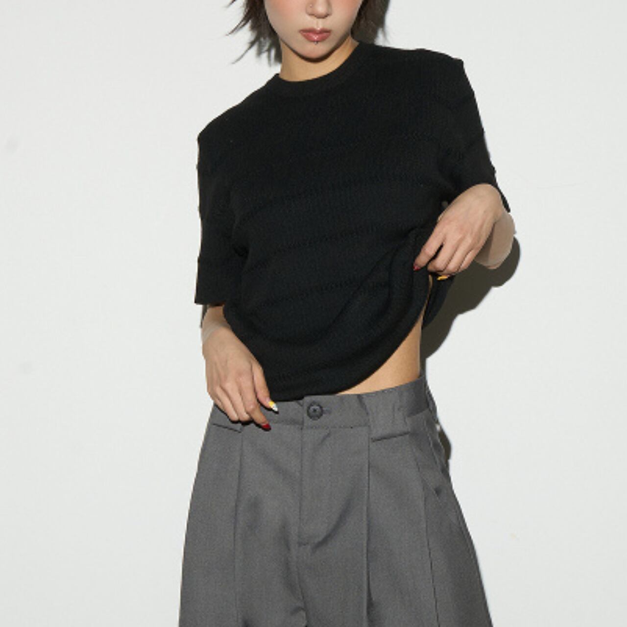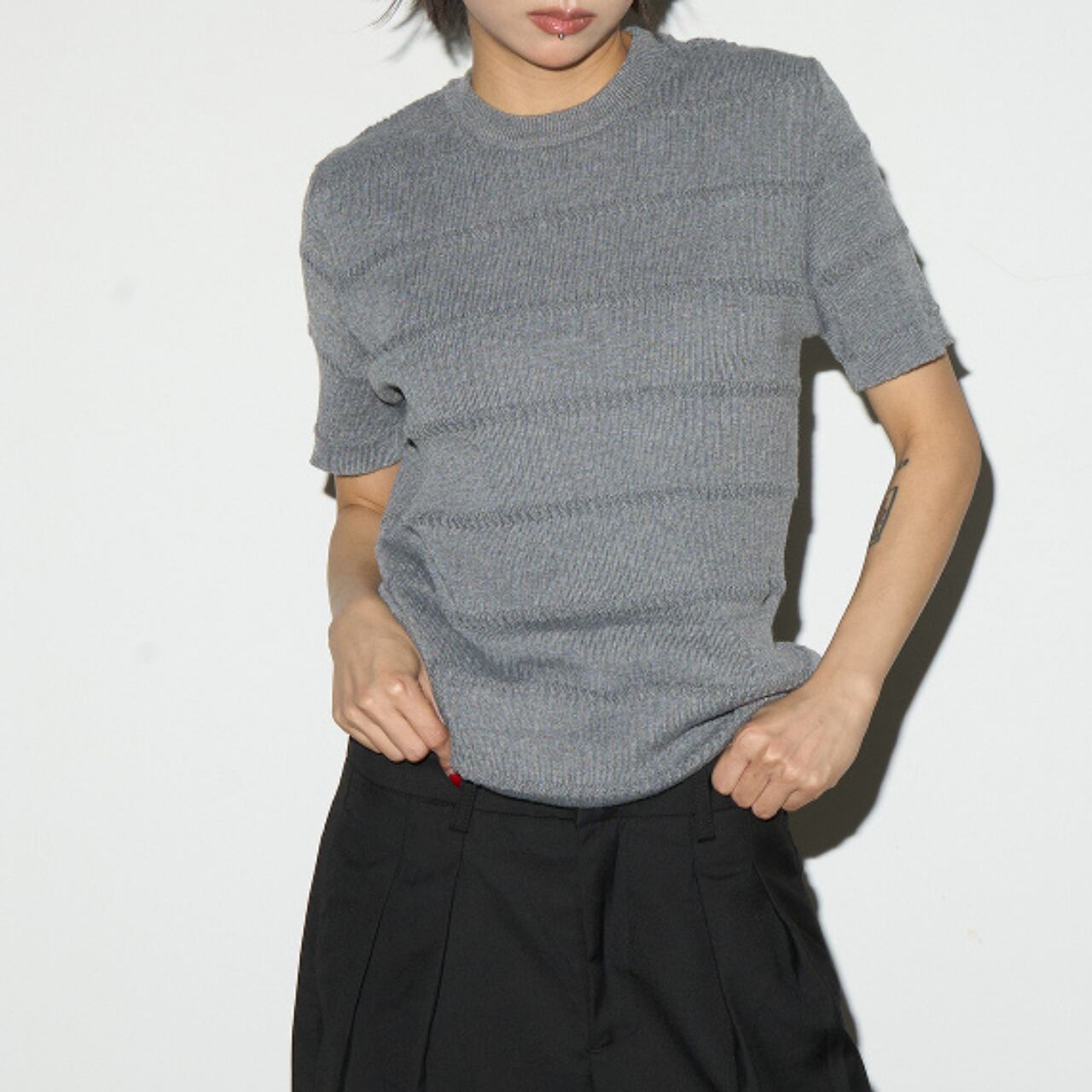 すっきりとしたクルーネックと、リブ編みの表情が特徴的な半袖ニットトップス。程よいフィット感で、体型を拾いすぎず、着心地の良さを実現しました。 デイリーユースはもちろん、様々なシーンで活躍する、ワードローブに欠かせない一枚になるでしょう。